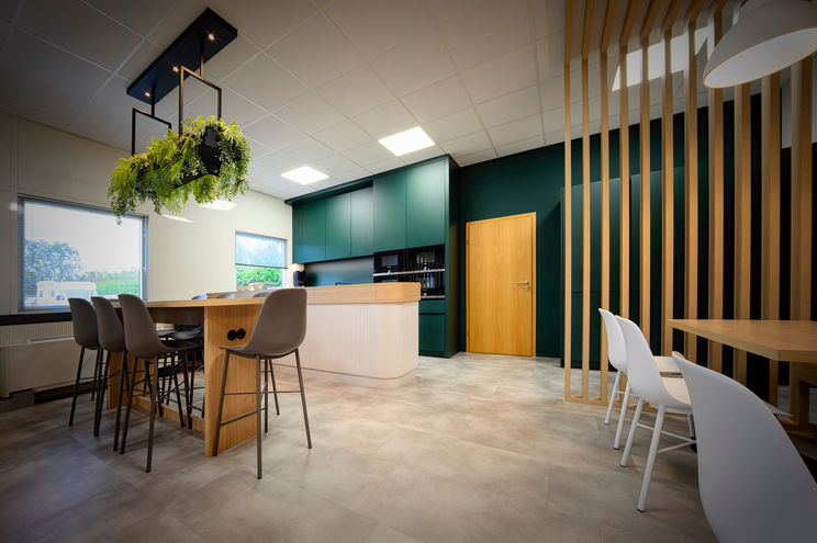 Die erste Zone, der Küchenbereich mit Theke und einem hohen Tisch mit Sitzgelegenheit lädt zu einem kurzen Plausch unter Kollegen ein.
