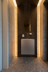 Auch das Gästebad und das Gäste WC im Erdgeschoss wurde in warmen Farben gestaltet. Das Highlight im Gäste WC ist die Indirekte Beleuchtung und der in Holzoptik geflieste Bereich, der von der linken Wand über die Decke bis